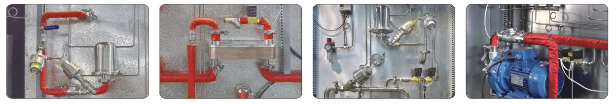 ● 304 altzairu herdoilgaitzezko hodi sanitarioak, junturak dituztenak. Alemaniatik inportatutako GEMU angelu-eserlekuaren balbula pneumatikoak hartzea, Taiwan AirTAC-ek hornitutako solenoide balbulak eta zuzenean konektatutako ur-eraztun huts-ponpa alemaniar SPECK-tik inportatutako.